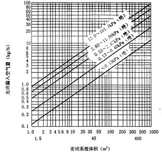 漏入系統的空氣量可按實測數據選取或參照同類生產裝置數據。無實測數據或參考數據時,可按抽空器前的真空系統設備、管線的總容積及壓力(絕)從圖A.0.1查取。真空系統中若有攪拌機時,每臺攪拌機再加2.3kg/h的漏入空氣量,若采用氣壓式直接混合冷凝冷卻器,還應包括冷卻水中放出的空氣量,其數值為冷卻水體積的2%。